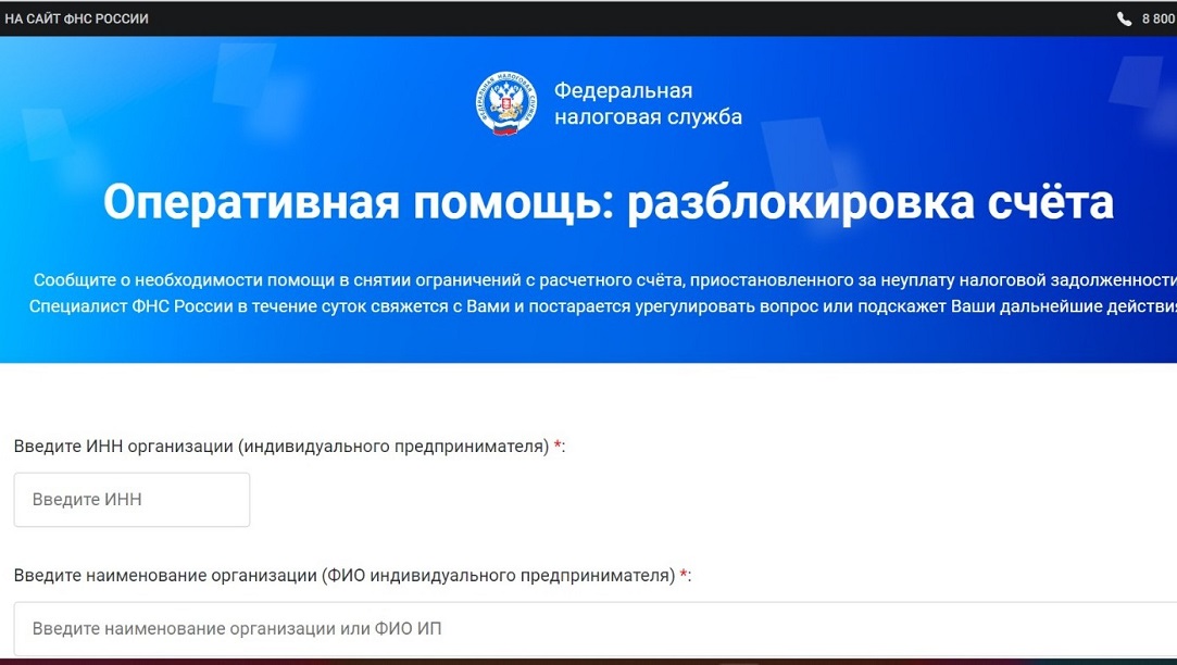 Для этого при заполнении формы необходимо указать наименование ЮЛ/ФИО, ИНН, БИК банка, в котором заблокирован счет, и контактный номер телефона.