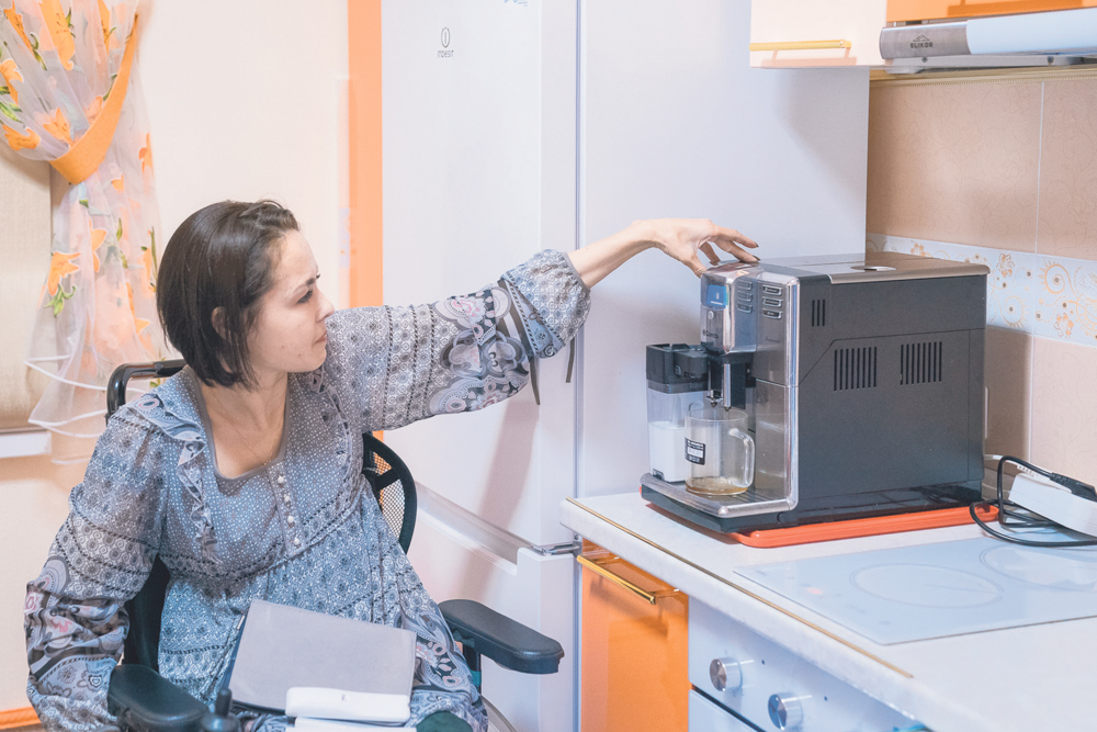 В другой умной квартире живет Ирина Башмакова: из-за редкого генетического заболевания с 16 лет она вынуждена передвигаться на коляске. Квартиру разрабатывали под нее индивидуально.