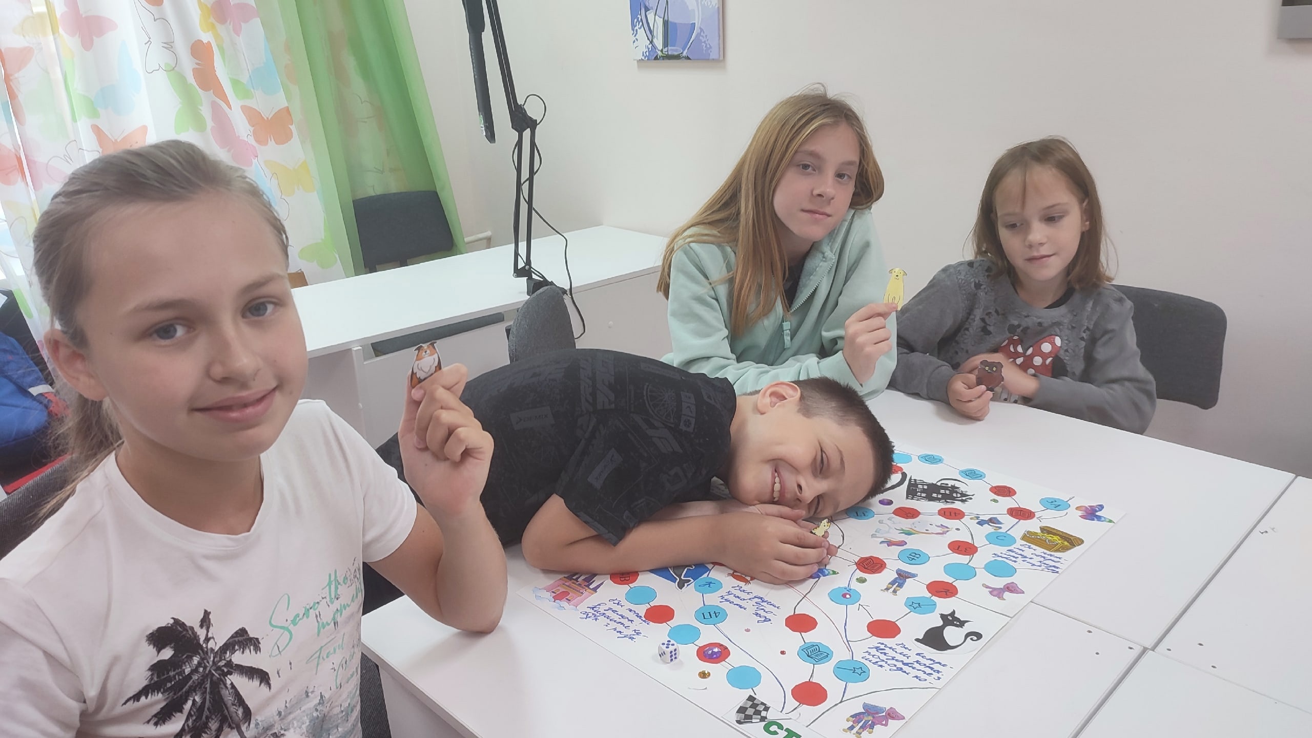 Ребята нарисовали игровое поле, украсив любимыми сказочными и мультперсонажами. Затем они придумали правила игры: на одной клетке игрока кусает летучая мышь, и он пропускает ход, на другой его встречает добрый джинн, добавляющий к ходу еще два шага. Для игры участники занятия сами изготовили себе фигурки: любимых персонажей, котиков, собачек вырезали его из бумаги, склеили и заламинировали скотчем, а затем поместили в специальную подставку.