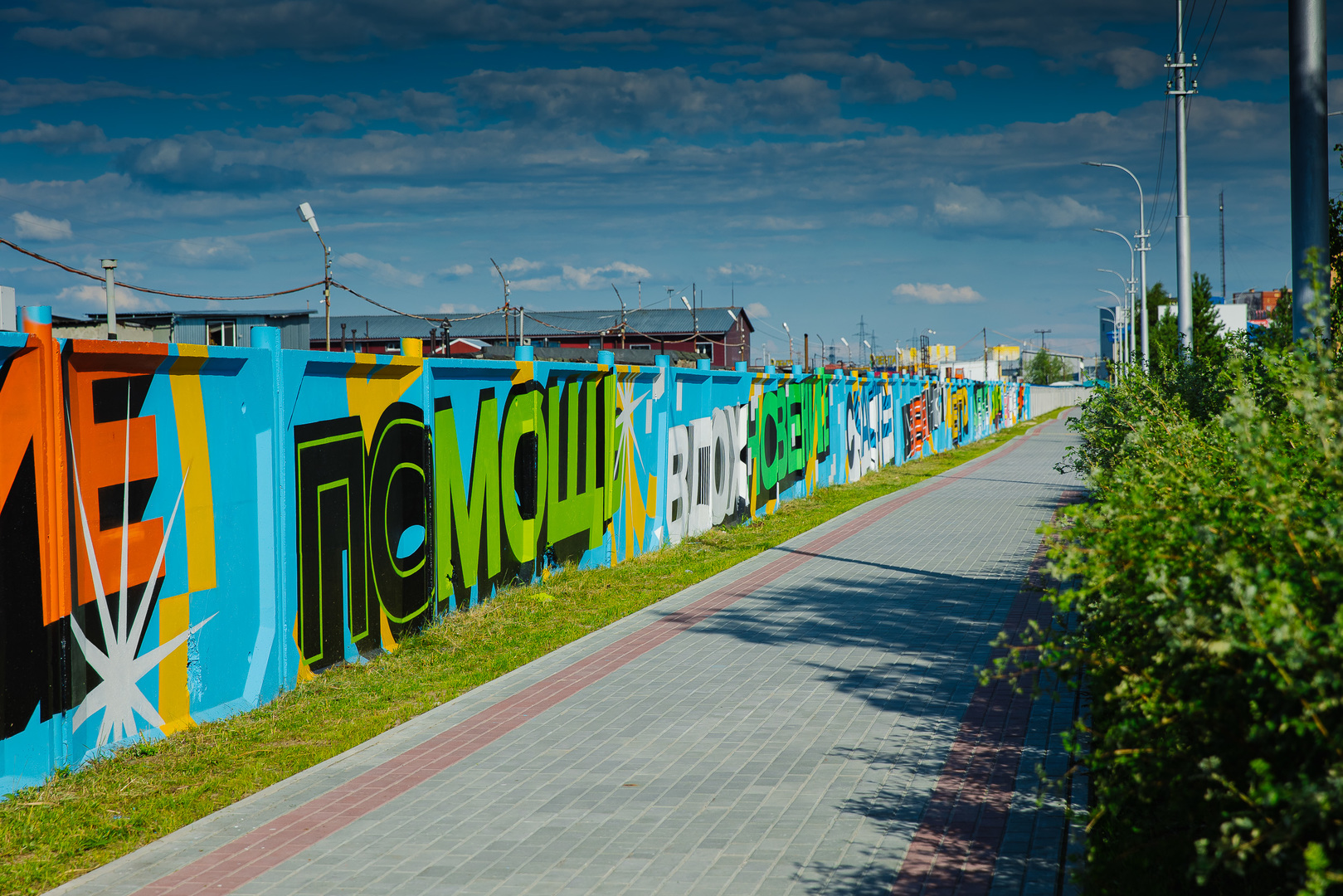 В Сургуте на бетонном ограждении напротив молодёжного центра «Цвет» художники нарисовали граффити на площади 260 квадратных метров. Молодые люди отразили в изображениях богатство смыслов русского языка.