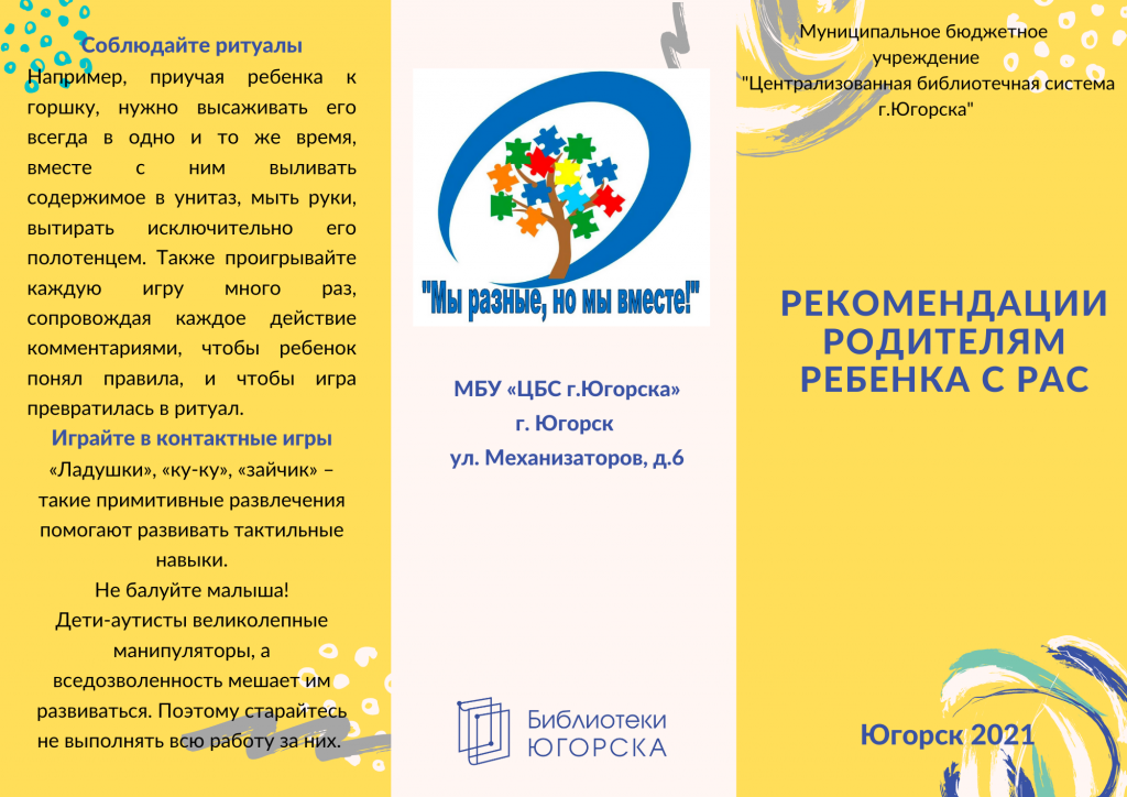Специалистами центральной городской библиотеки разработан буклет "Рекомендации родителям ребенка с РАС".