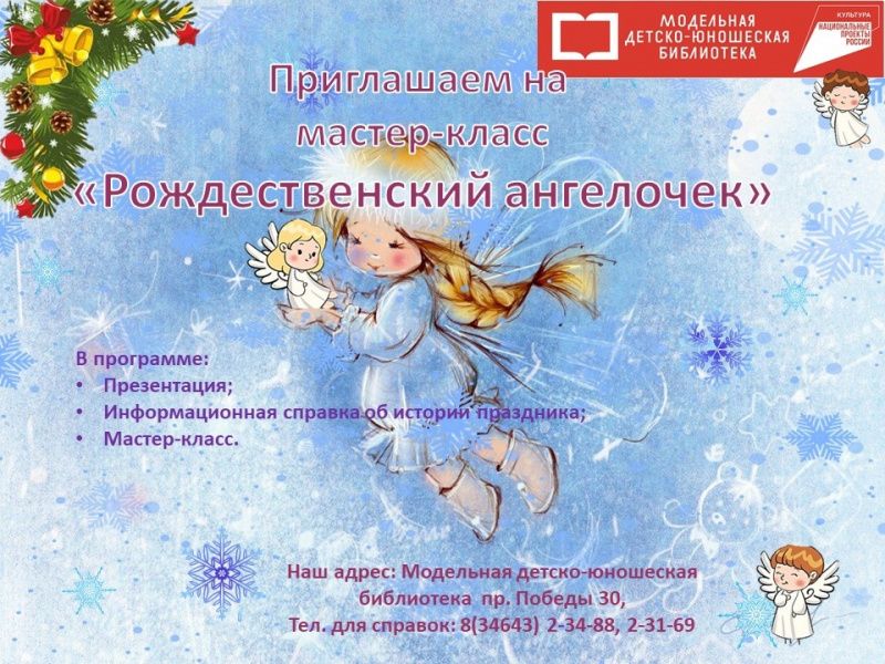 4 января, в честь Рожественских праздников, в Модельной детско-юношеской библиотеке пройдет мастер-класс по изготовлению символа праздника - Рождественского ангела. Перед началом работы участникам мастер-класса будет показана красочная презентация, где дети узнают об истории праздника, его традициях и символах.