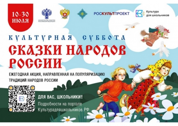 С 10 по 30 июля 2024 года в рамках культурно-образовательного проекта «Культура для школьников» проходит Всероссийская ежегодная акция «Культурная суббота», направленная на популяризацию традиций народов России. В этом году она посвящена народным сказкам.