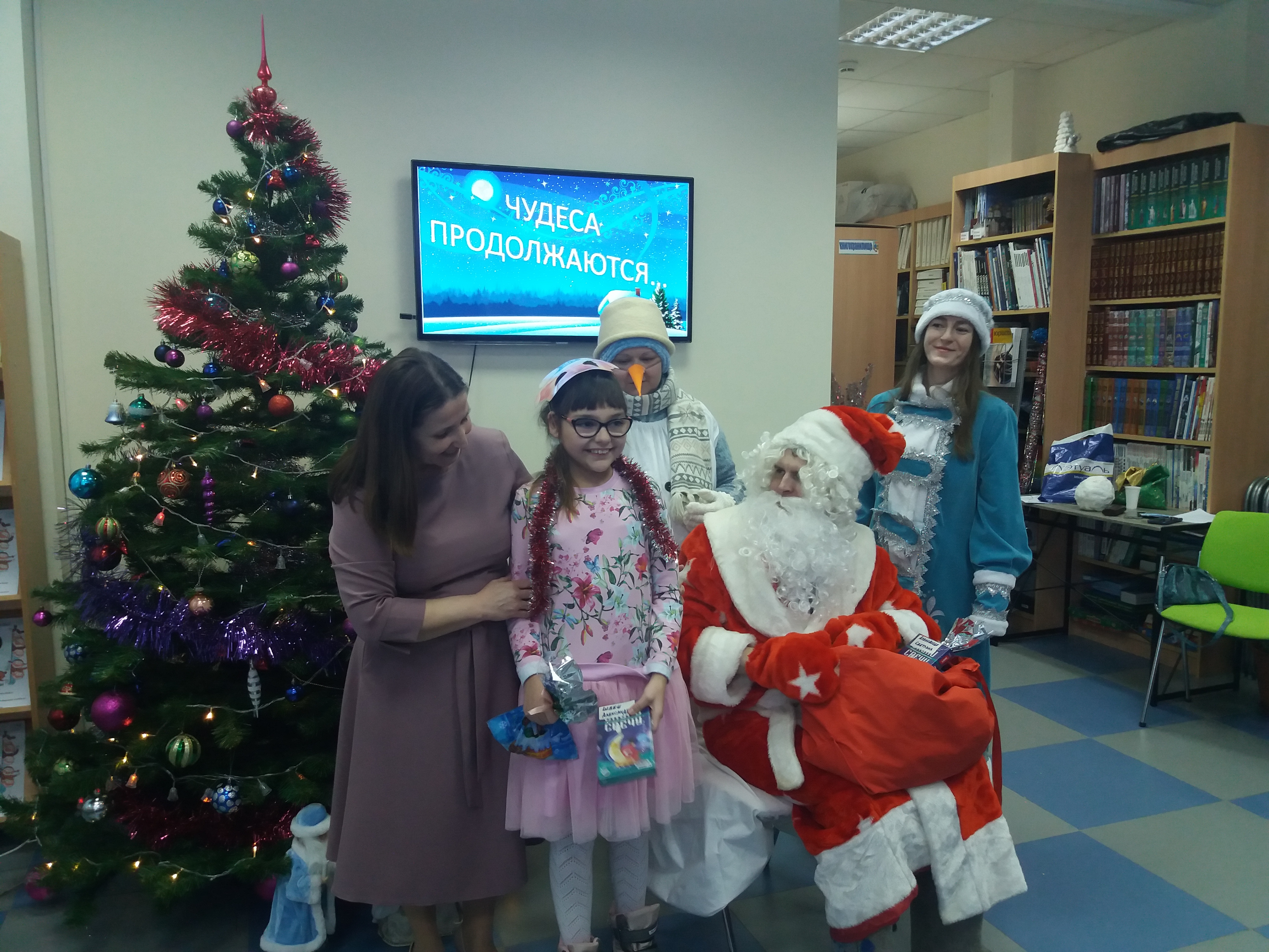 Дети активно участвовали в представлении со Снеговиком, Снегурочкой и Дедом Морозом. Все вместе пели новогодние песни, танцевали, водили хоровод и помогли Деду Морозу зажечь гирлянды на новогодней ёлочке. Особенно юным читателям понравилось лепить с Дедом Морозом Снеговика. Ребята рассказывали стихи, играли в музыкальную игру. Каждый получил от Деда Мороза подарок – мешочек со сладостями и фотографию на память со сказочными героями.
