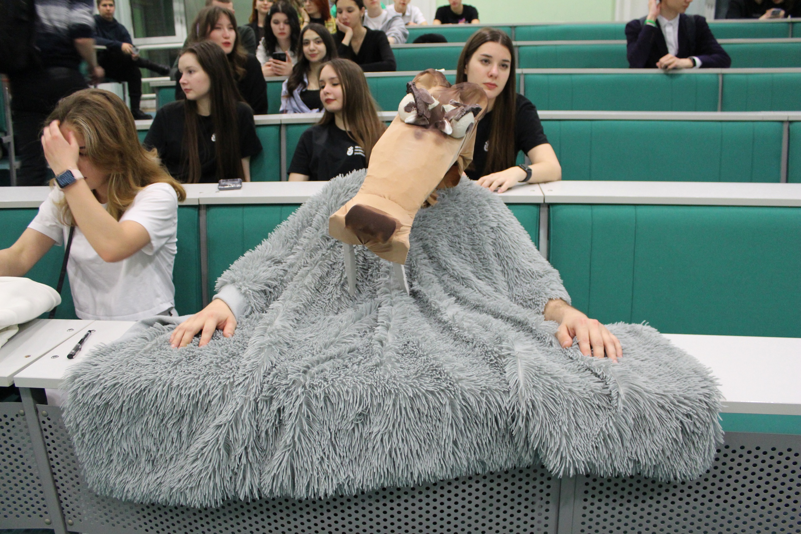 У самого входа в аудиторию развешан серебристый дождик. Несмотря на то, что до собрания еще десять минут, зал полностью переполнен, на задних рядах ребятам приходится стоять. С трудом удаётся найти свободное место. Все были одеты кто как: кто-то был в костюме белки из Ледникового периода, кто-то в новогодних шапках, а кто-то решил, что спортивок достаточно.