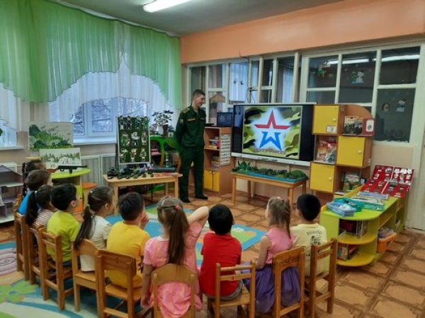 Дети с восхищением смотрели на подтянутого, в красивой армейской форме молодого парня. Курсант рассказал своим младшим друзьям об учебе, поделился своим отношением к военной службе и впечатлениями об институте и выбранной профессии. Заинтересовал ребят презентацией о многообразии военных специальностях и их значении для армии, продемонстрировал иллюстрации формы современных солдат, объяснил значение отличительных нашивок на погонах. Военный – это профессия героическая, уважаемая и очень нужная; если вступил на этот путь, то должен быть готов к насыщенной учебной программе, серьезным занятиям, частым соревнованиям. Дошкольники поняли, какими качествами должен обладать будущий защитник и что любая служба очень опасна и непроста, но нести её нужно с честью и быть верным Родине.