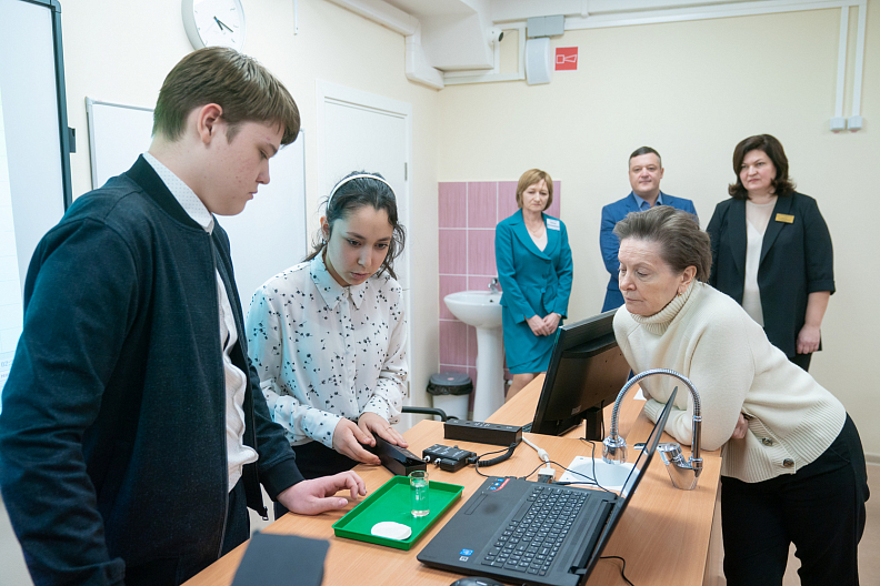 Ученики класса по углубленному изучению химии продемонстрировали главе региона опыт по электролизу раствора соли. Ученики рассказали, что рады вернуться в школу, которая оснащена современным оборудованием и есть возможность достойно подготовится к поступлению в вузы.