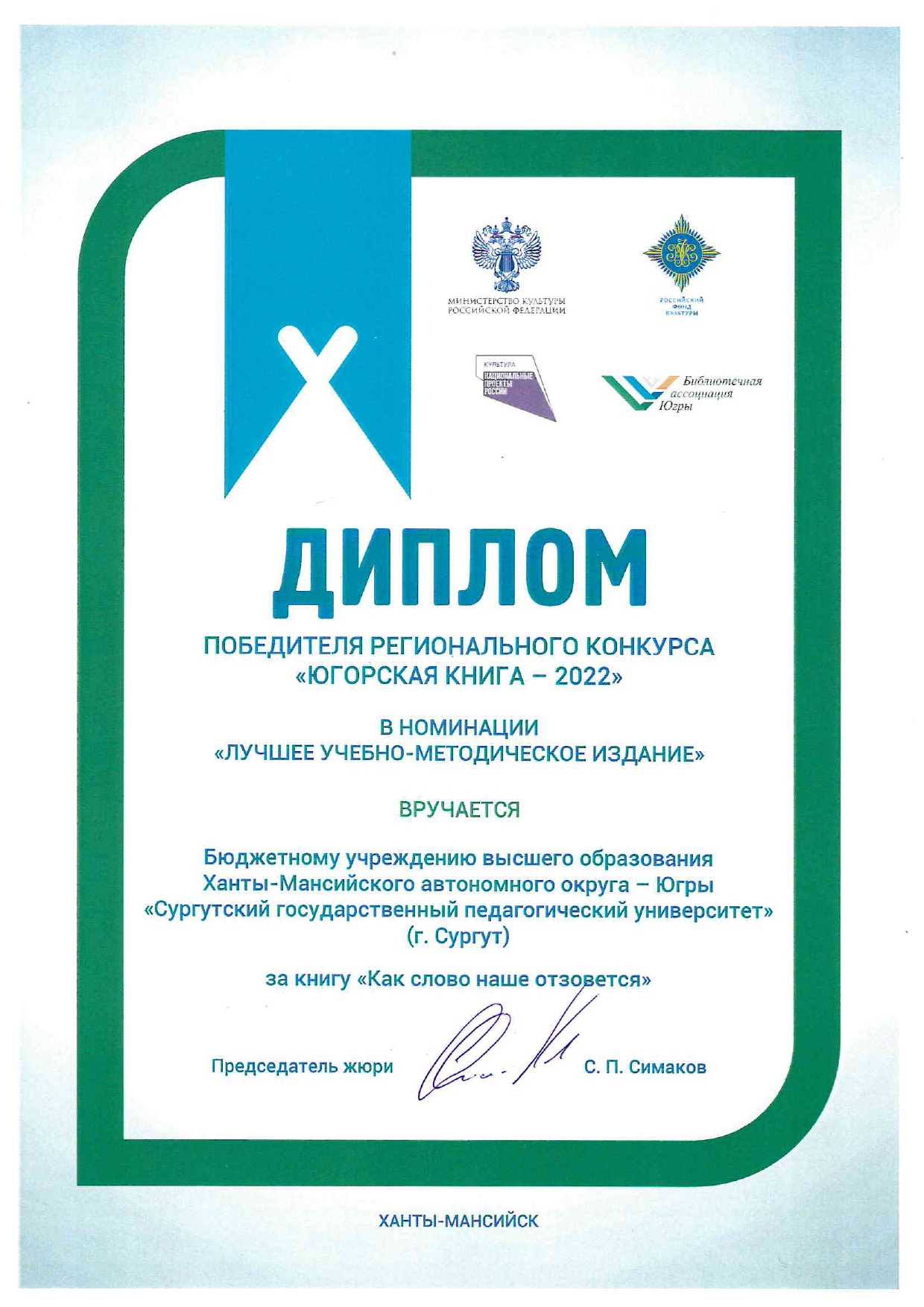 В региональном конкурсе «Югорская книга-2022», проводимом государственной библиотекой Югры, в номинации «Лучшее учебно-методическое издание» победила книга авторского коллектива преподавателей кафедры филологического образования и журналистики СурГПУ « Как слово наше отзовется»: филологический компонент в организации воспитательной работы в вузе и школе» , обобщающее лучшие методические практики воспитательной работы филологического факультета СурГПУ, сформированные многолетними традициями.