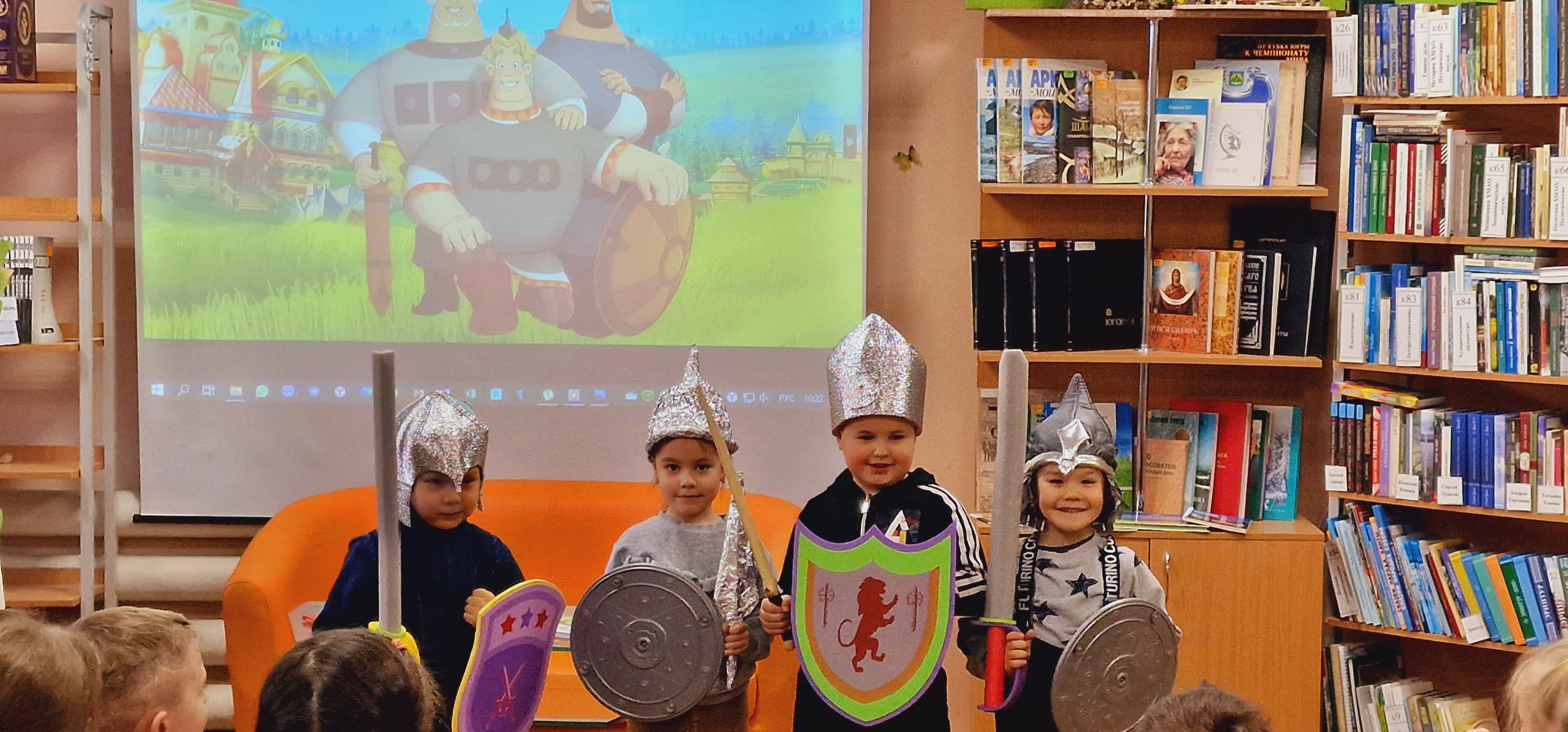 Участники просмотрели видеоролик "Богатыри земли русской", поговорили на тему "Кто такие богатыри?", а также приняли участие в игре-угадайке "Собери богатыря в поход". В заключении мероприятия просмотрели короткометражный мультфильм "Три богатыря".