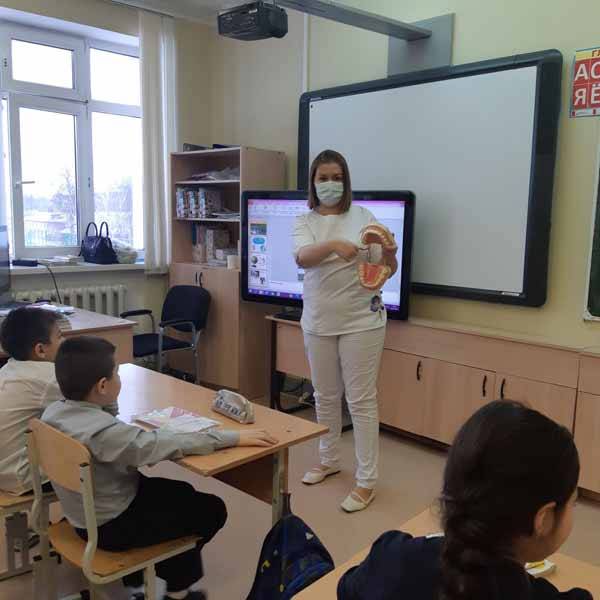 В школах города Ханты-Мансийска №2 и №5 накануне праздничных дней специалисты Учреждения Инна Николаевна Овчинникова, Елена Юрьевна Пузина и Яна Сергеевна Федорова провели уроки гигиены, на которых дети познакомились с функцией зубов, со средствами индивидуальной гигиены полости рта, а также техникой чистки зубов.