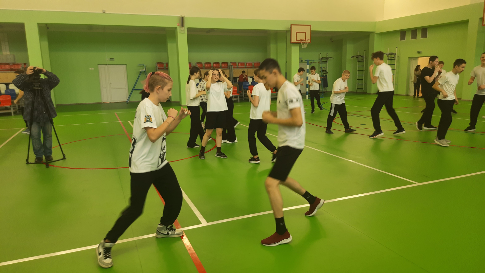 Провести зарядку с учениками 8 класса пришла Ева Форова – воспитанница клуба «Вымпел», многократная победительница городских, окружных соревнований по кикбоксингу, чемпионка Всероссийского турнира Moscow open, чемпионка России по шахбоксу. В обычной, не спортивной жизни, Ева учится в 7 классе средней школы № 19.