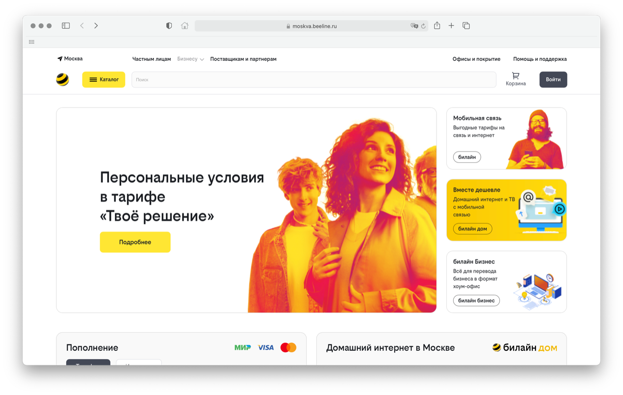 Полностью обновилась и главная страница beeline.ru , поиск по сайту, а также карточки товаров. Изменения затронули как полную, так и мобильную версию сайта. Последняя стала работать гораздо быстрее, в том числе и за счет отказа от загрузки новых страниц в пользу раскрывающихся pop-up с информацией о товаре в каталоге интернет-магазина.