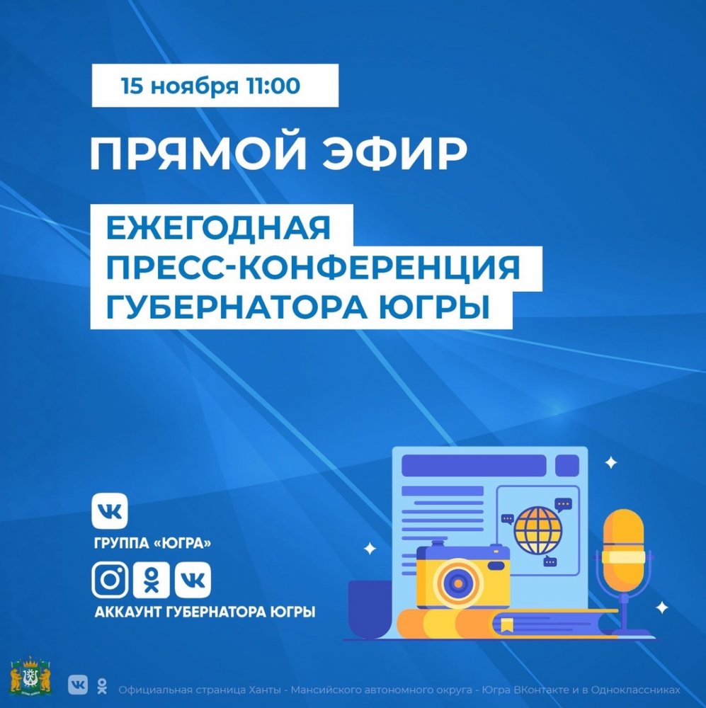 15 ноября в 11.00 губернатор Наталья Комарова выйдет в прямой эфир и ответит на вопросы жителей автономного округа в рамках ежегодной традционной пресс-конференции.