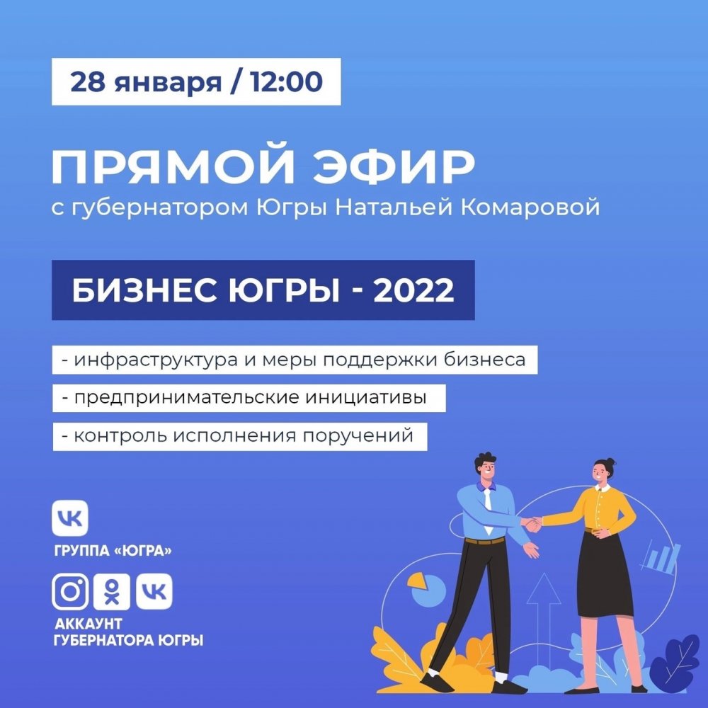 – В пятницу, 28 января, приглашаю вас, уважаемые подписчики, присоединиться к прямому эфиру. Обсудим эффективность работы инфраструктуры и мер поддержки для бизнеса, предпринимательские инициативы, новые проекты и возможности участия в них. Оценим исполнение поручений. Они размещены на официальном сайте государственных органов власти Югры admhmao.ru во вкладке «Губернатор», разделе «Поручения», – написала Наталья Комарова в социальных сетях.