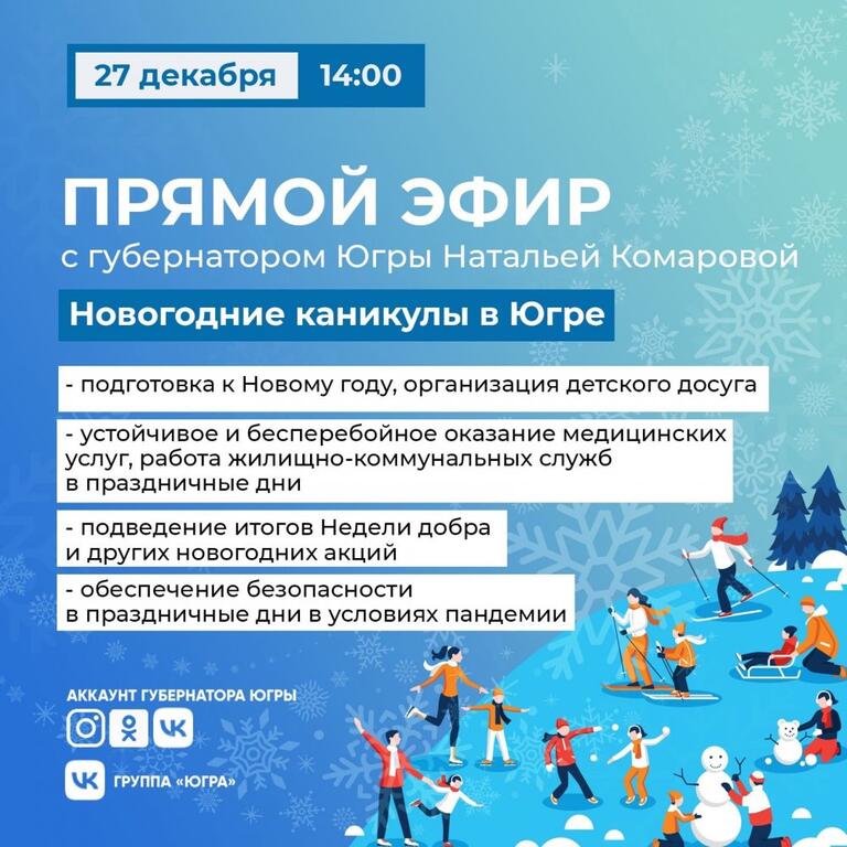 В Югре пройдет очередной прямой эфир с участием жителей округа и губернатора Натальи Комаровой. Разговор, как анонсировала глава региона, будет посвящен обсуждению общих вопросов и планов на новогодние каникулы