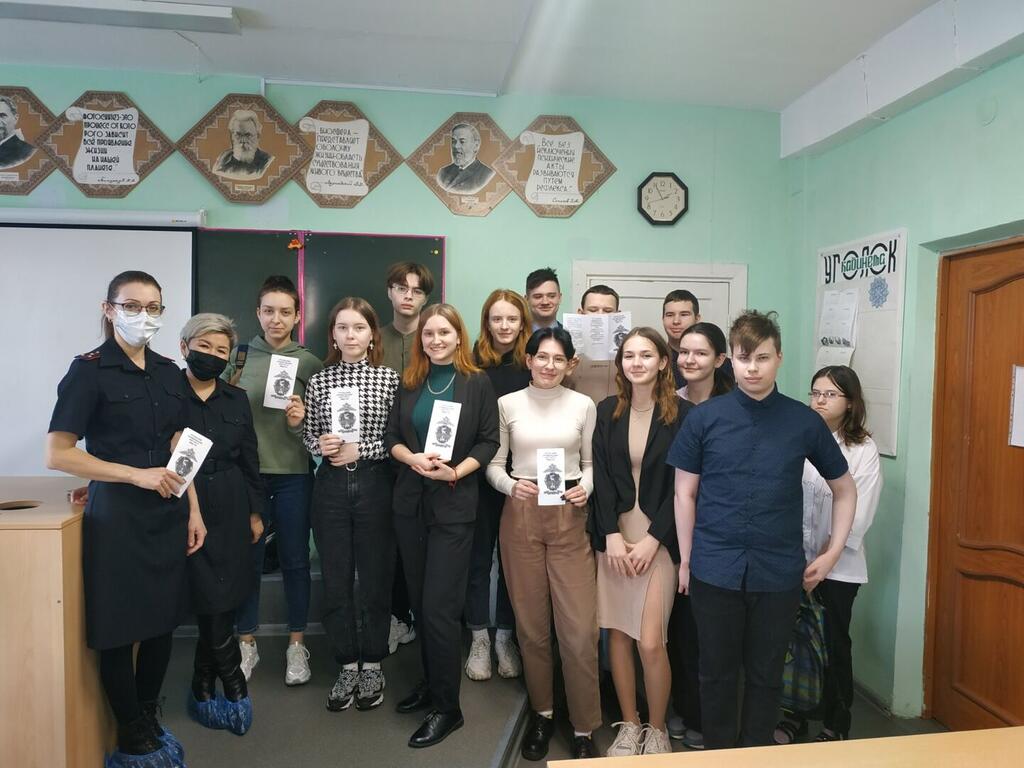 Ребята узнали о том, что при отборе кандидатов на службу в МВД России особое внимание уделяется их образовательному уровню, морально-деловым качествам, состоянию здоровья и физической подготовке. Старшеклассникам также раздали буклеты о высших учебных заведениях МВД России.