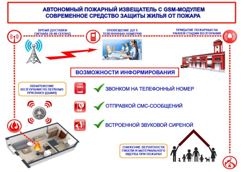 Особую популярность получили пожарные извещатели с GSM-модулем, которые позволяют одновременно передавать звонки и СМС сообщения о пожаре на телефоны шести абонентов, к которым можно отнести самого собственника жилья, подразделения пожарной охраны, ЕДДС, родственников, соседей и других заинтересованных лиц. Кроме этого, данные извещатели устойчивы к ложным срабатываниям, оснащены встроенной сиреной и осуществляют бесперебойную работу от одной батареи не менее 3 лет.