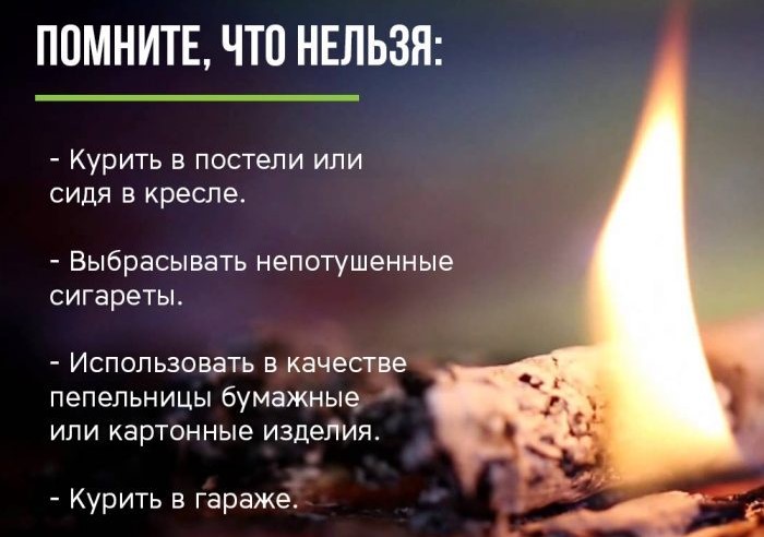 курить в постели или сидя в кресле, тем более, если выпили спиртное - в таком положении очень легко заснуть. А если вовремя не потушить сигарету, от нее может загореться одежда или мебель. даже потушенные сигареты не бросайте в урны с бумагами и другими горючими отходами - они могут загореться. не следует в качестве пепельницы использовать бумажные кульки, коробки от спичек или сигарет. ни в коем случае нельзя курить в гараже - близость автомобиля и легковоспламеняющихся жидкостей могут спровоцировать пожар. необходимо следить за тем, чтобы спички или сигареты не попадали в руки маленьким детям.Также нужно быть осторожным при курении на лестничной площадке. Ни в коем случае не допускается бросать непогашенные сигареты в нижние пролеты или шахту лифта. Особенно такие действия опасны при размещении в подвальных этажах коммерческих организаций, которые складируют на общих лестничных площадках сгораемые материалы в нарушение требований пожарной безопасности. Тление газетной бумаги или картона, не говоря уже о пластике, достаточно, чтобы отрезать путь эвакуации и вызвать панику граждан.
