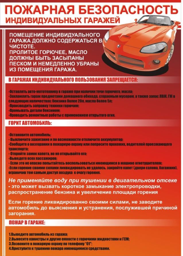 не сушите картофельные ямы открытым огнем и не позволяйте это делать соседям; при длительной стоянке техники отключайте электропроводку автомобиля от аккумуляторной батареи; позаботьтесь о средствах первичного пожаротушения (огнетушителях); наведите надлежащий противопожарный порядок в самих постройках: уберите запас топлива свыше 20 литров бензина и 5 литров масла; не выполняйте огневые работ и не используйте открытый огонь; приведите в порядок территорию, прилегающую к гаражу, уберите сгораемый мусор и сухую траву, а также пролитую легковоспламеняющуюся жидкость, засыпав ее песком. не храните в гараже спецодежду, пропитанную топливо-смазочными материалами; категорически запрещается производить в гараже малярные работы, а также промывку деталей керосином, бензином или другими легковоспламеняющимися жидкостями, а также зарядку аккумуляторов на транспортных средствах; все токоведущие части электропроводки должны быть изолированы. Переносные лампы допустимо использовать только заводского изготовления; в гаражах запрещено использовать электронагревательные приборы.При возникновении пожара: