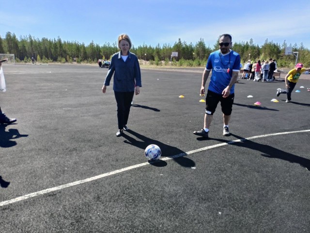 Уполномоченный по правам ребенка в ХМАО посетила Сургутский район в среду, 12 июня. Она прияла участие в праздничных мероприятиях, посвященных Дню России, и попробовала свои способности в одном из активностей – пробила пенальти и попала точно в угол ворот.