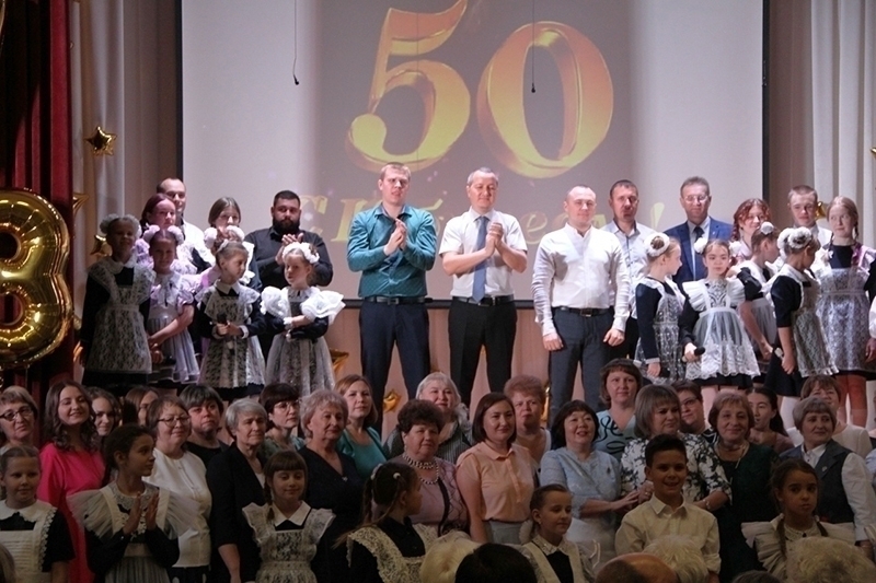 В актовом зале привлекли внимание часы, где отсчёт стрелки пошёл с 1973 года. Юбилейная программа началась со сценки, в которой сыграли три героя – два школьника и фотограф. Взрослый объяснял детям, что время мимолётно, а его задача в том, чтобы запечатлеть цифры, которые переживут века. После выступления голос за кадром поведал гостям школы об истории, на экране сменялись одна за другой старые фотографии.