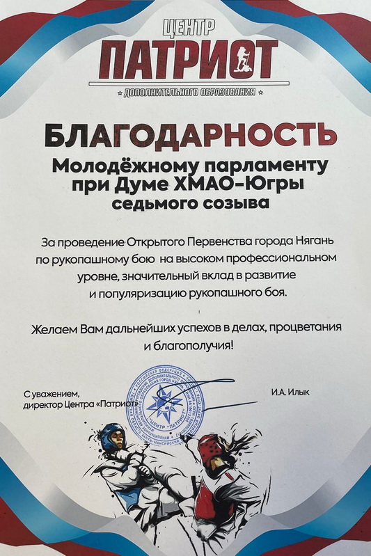 Игорь Илык благодарит молодых политиков за работу в организации Открытого Первенства по рукопашному бою в городе Нягани на высоком профессиональном уровне, значительный вклад в развитие и популяризацию этого спортивного единоборства.