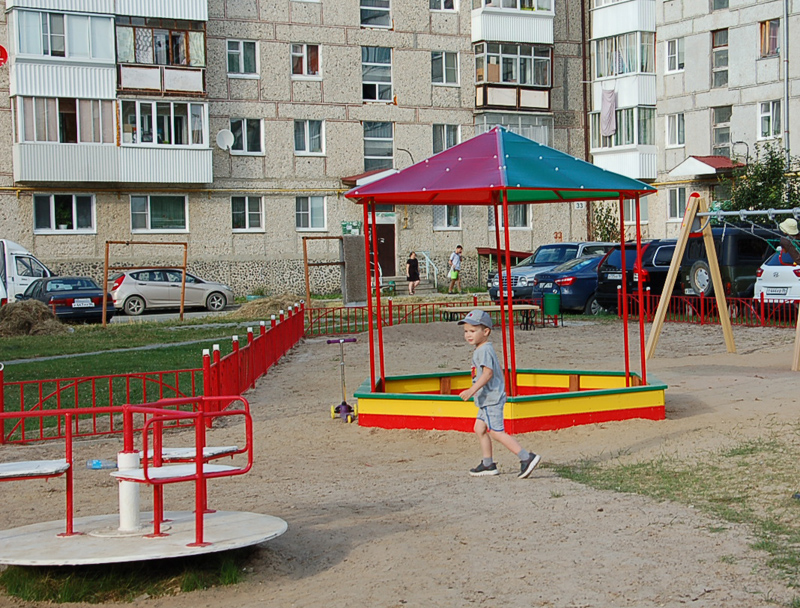 В каре домов 32–33 мальчишки гоняют мяч, не опасаясь случайно попасть в припаркованную неподалеку машину – ограждение удержит случайный полет мимо ворот. Кстати, к футбольному полю прилагались и новые футбольные ворота. А рядом на площадке разместились качели, карусель, спортивный комплекс, просторная песочница, удобные скамейки – все в ярких цветах.