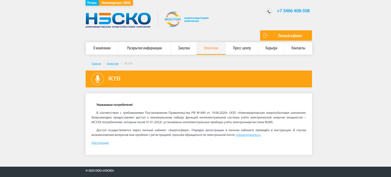 С 1 марта 2023 года в соответствии с требованиями Постановления Правительства РФ №890 от 19.06.2020г. «НЭСКО» безвозмездно предоставляет доступ к минимальному набору функций интеллектуальной системы учета электрической энергии (мощности) – ИСУЭЭ – потребителям, которым после первого января 2022 года установлены интеллектуальные приборы учета электроэнергии. Доступ к ИССУЭ для вартовчан осуществляется через технический личный кабинет «Энергосфера».