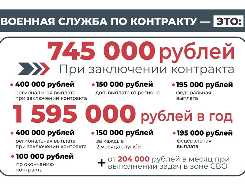 В сумму денежного довольствия входят: – 400 000 рублей – от правительства Югры; – 195 000 рублей – федеральная выплата от Минбороны РФ; – 150 000 рублей – за каждые два месяца службы.