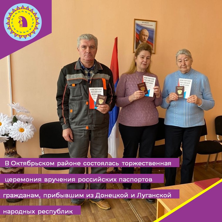 В Октябрьском районе состоялась торжественная церемония вручения российских паспортов гражданам, прибывшим из Донецкой и Луганской народных республик