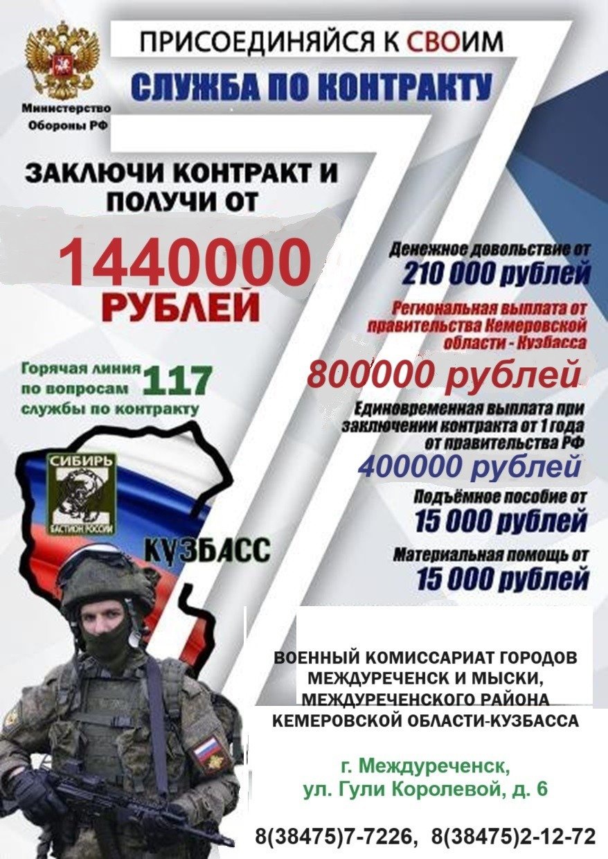 Кузбассовцам предлагают поступить на военную службу по контракту Денежное довольствие от 210 000 рублей Региональная выплата от правительства Кемеровской области – Кузбасса 800 000 рублей Единовременная выплата от п