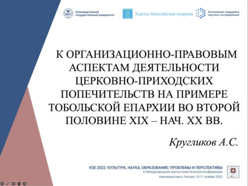 Руководитель отдела образования и катехизации Нижневартовского городского благочиния, д. Александр Кругликов, в рамках просветительских мероприятий, приуроченных к Международным Рождественским образовательным чтениям в городе Нижневартовске, выступил с докладом «К организационно-правовым аспектам деятельности церковно-приходских попечительств на примере Тобольской епархии во второй половине XIX – начале XX вв.» на секции «Гуманитарные и социально-экономические исследования в новой парадигме научного знания» X Международной научно-практической конференции «KSE 2022: Культура, наука, образование: проблемы и перспективы». В рамках работы секции были обсуждены вопросы религиозной безопасности и деятельности деструктивных религиозных групп в глобальной сети, взаимодействия высших учебных заведений с традиционными религиозными организациями, философии, как феномене культуры, ее особенностях и значении, воспитания молодого поколения и деятельности волонтеров, а также организации Палестинских чтений епархиальными отделами Православного Палестинского общества в к. XIX — нач. XX вв.