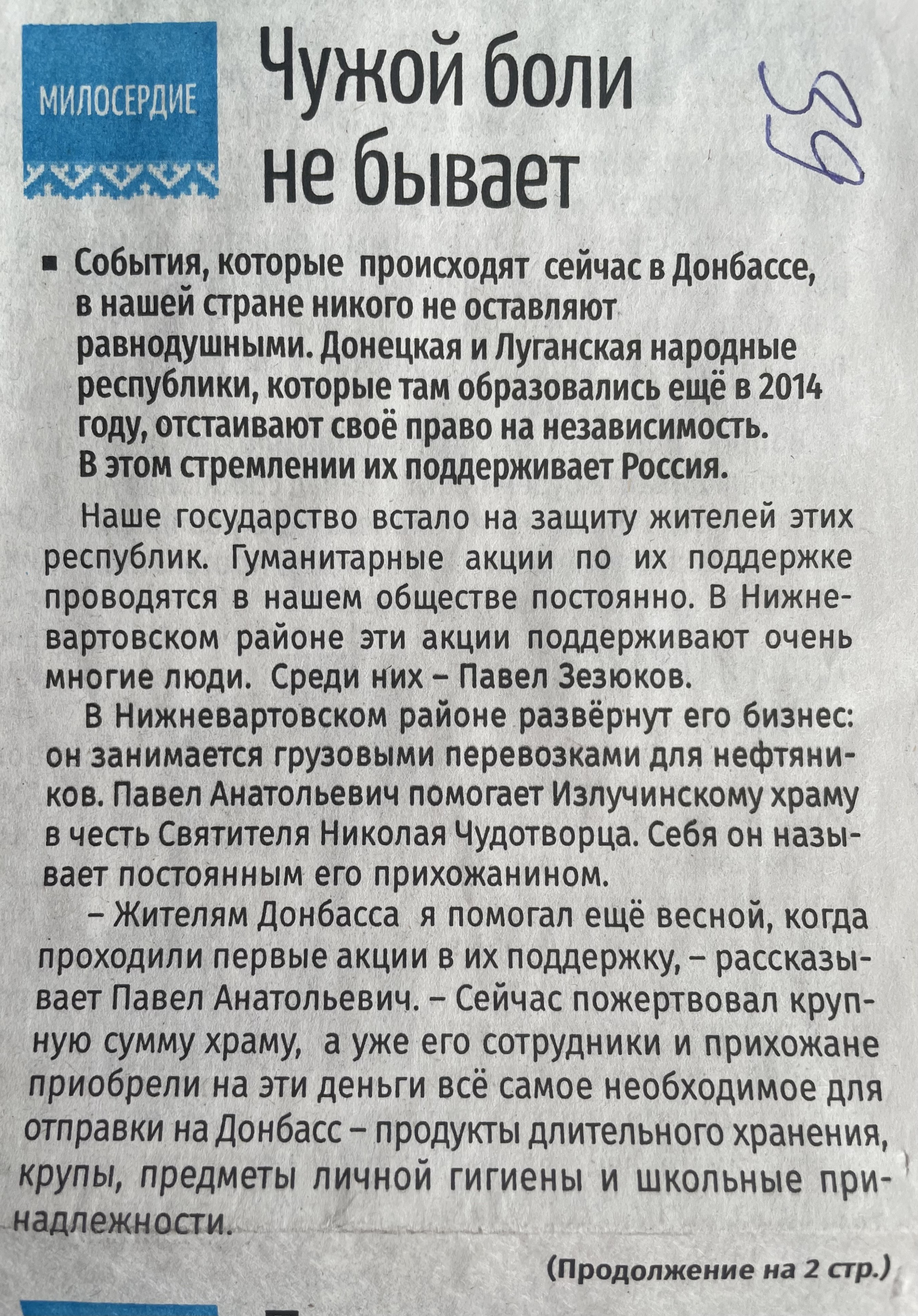 Наше государство встало на защиту жителей этих республик. Гуманитарные акции по их поддержке проводятся в нашем обществе постоянно. В Нижневартовском районе эти акции поддерживают очень многие люди. Среди них – Павел Зезюков.