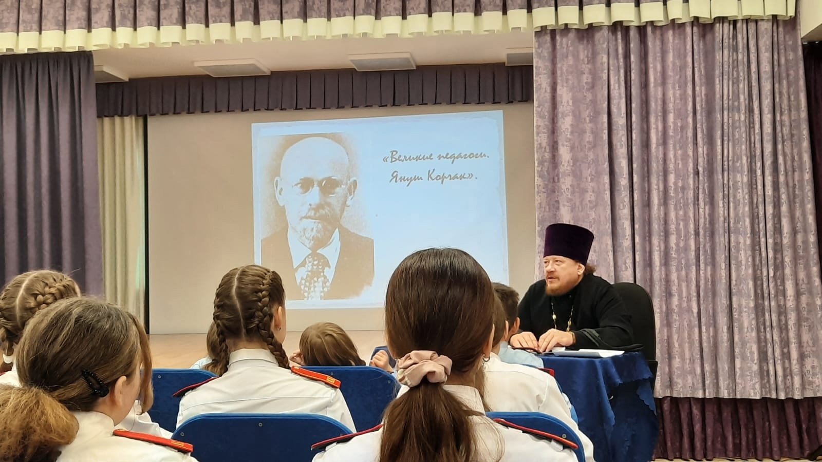 Настоятель Прихода храма в честь святых первоверховных апостолов Петра и Павла иерей Алексий Константинов на очередном занятии рассказал учащимся о педагоге Януше Корчаке.