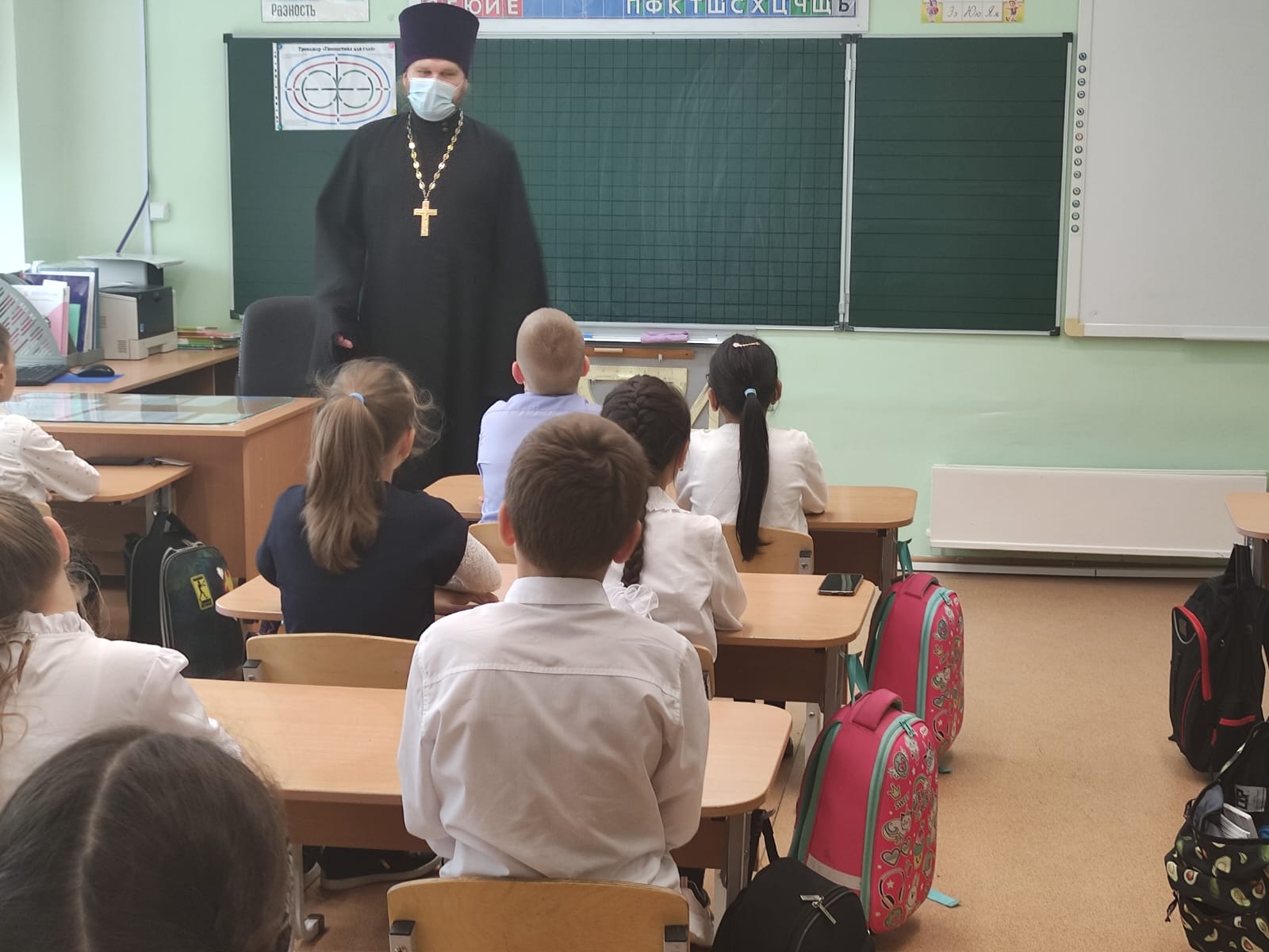 9 сентября 2022 года настоятель Храма в честь великомученика Феодора Стратилата иерей Димитрий Галицкий посетил СОШ № 5 пгт.Фёдоровский где побеседовал с учащимися 4 классов на тему: