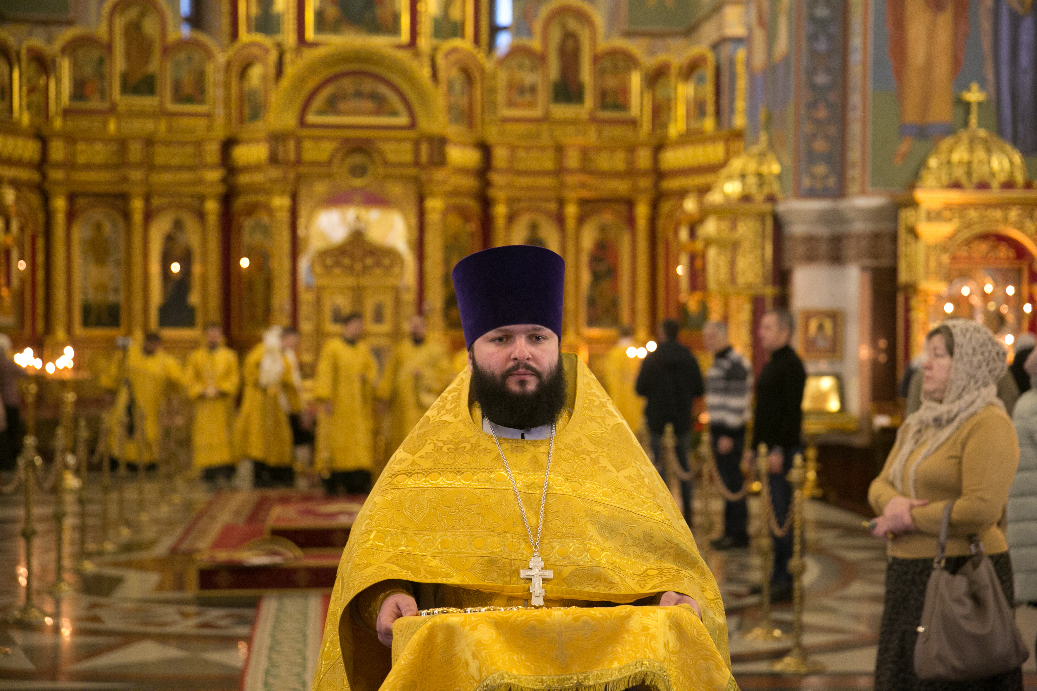 На сугубой ектении были вознесены особые прошения, ключарь Воскресенского кафедрального собора иерей Александр Петюр прочитал молитву о Святой Руси .