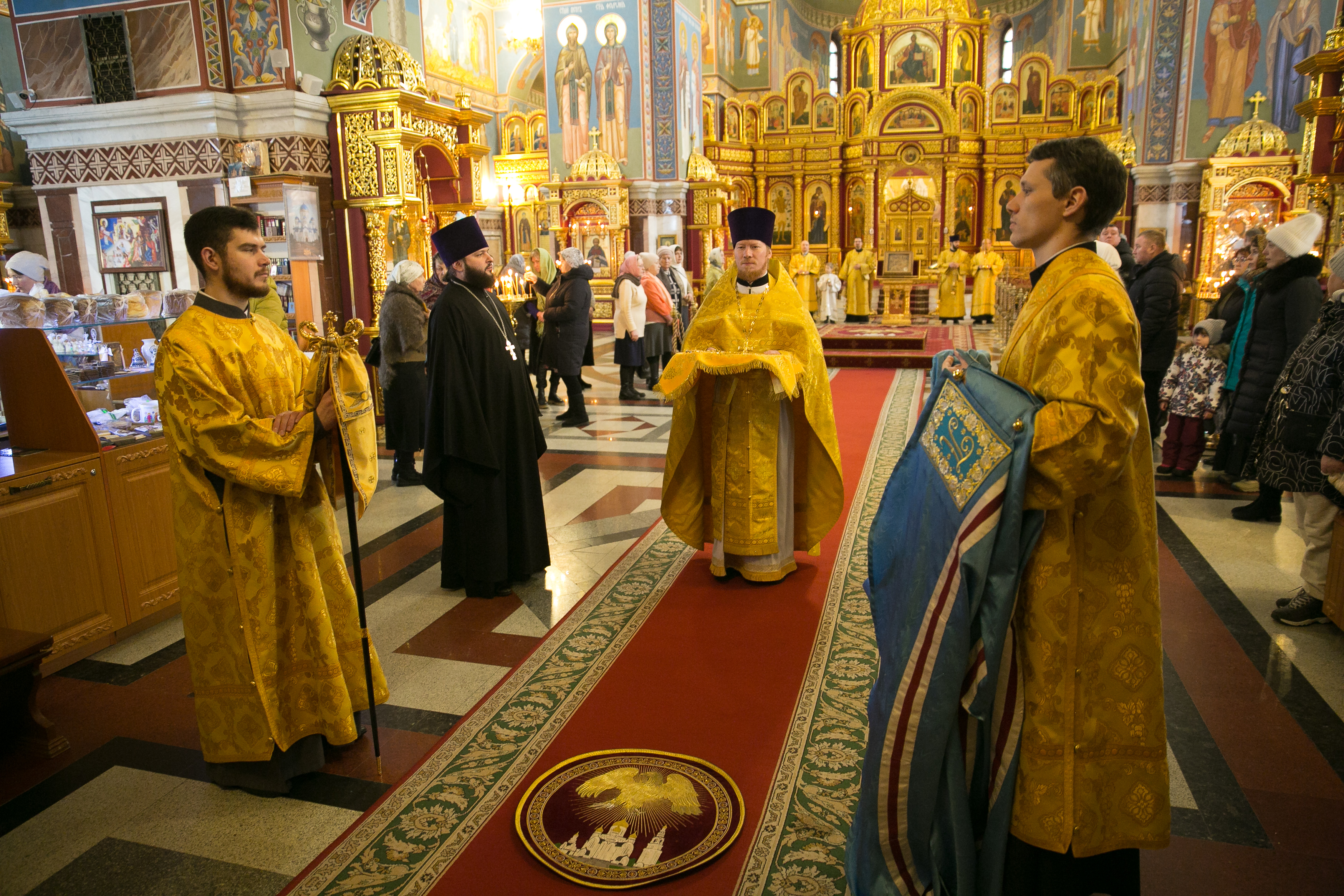 На сугубой ектении были вознесены особые прошения, ключарь Воскресенского кафедрального собора иерей Александр Петюр прочитал молитву о Святой Руси .