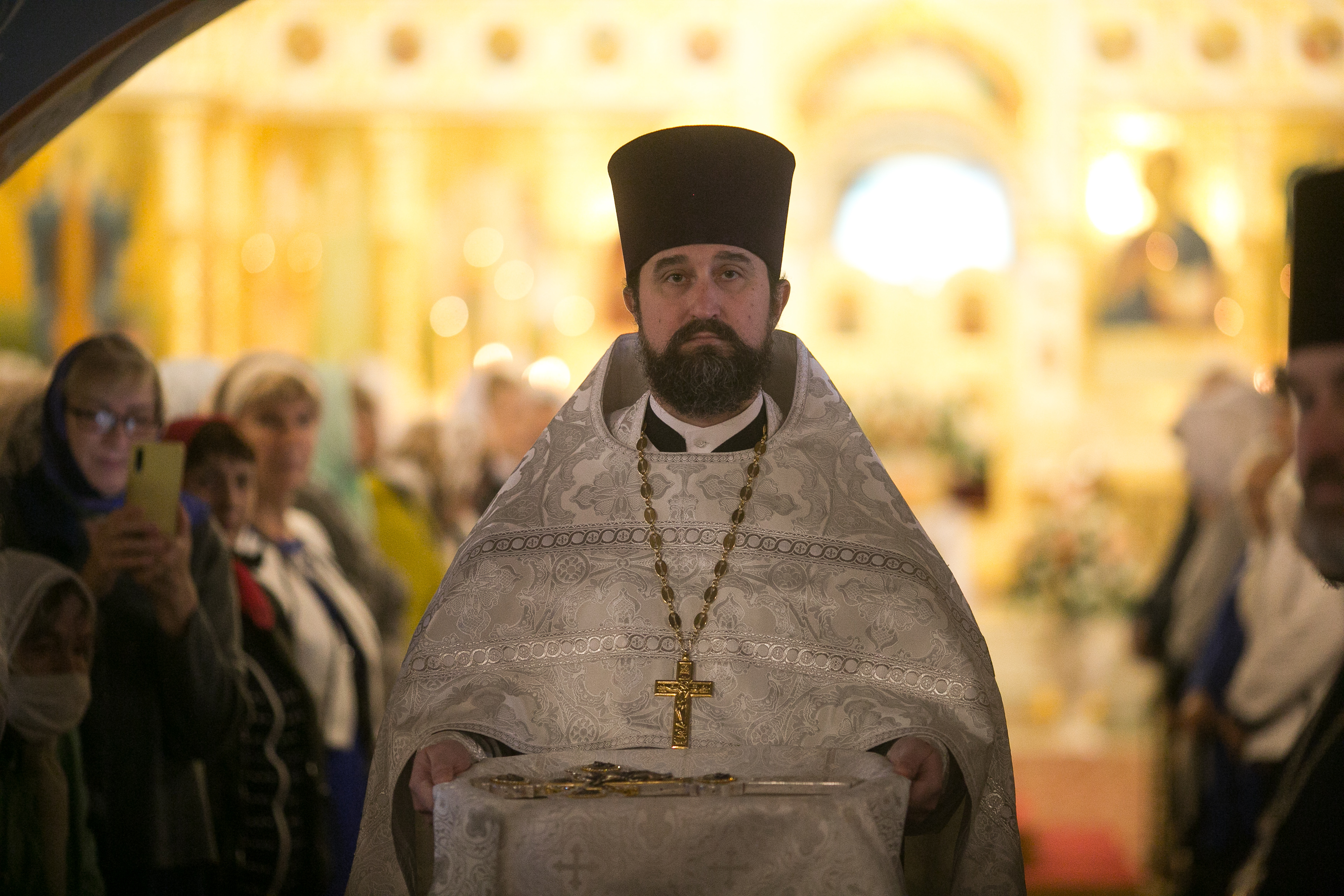 «Дорогие отцы, братья и сестры, позвольте от сердца, от души, поздравить всех с двунадесятым праздником Преображения Господа Нашего Иисуса Христа! Для нашего собора это особый праздник, ибо он является престольным днём и мы все всегда обращаемся в первую очередь к преобразившемуся Господу и просим и молим Его, чтобы преобразил наше естество, просветил бы каждого из нас Светом Истины и Правды. Той Истины, которую Он принёс для спасения каждого из нас, и я надеюсь, что каждый сегодня пришёл прославить Преображенного Господа, чтобы преобразить своё естество духовное и физическое, исправить свою жизнь, и это самое главное для нас с вами — приблизиться к Богу, очиститься от грехосплетений, приобретаемых нами каждый день нашей жизни. «Хорошо нам быть, Господи, здесь»,- говорят Спасителю апостолы на горе Фаворской, и это очень важно — чувствовать помощь Божию, и нет большего счастья, чем быть с Богом. Дай Бог нам убелиться, просветиться хотя бы немного светом Преображения Нашего Спасителя. Я всем искренне этого желаю, всех благодарю за общие молитвы! Я хотел бы сегодня, в этот особый день, подарить нашему собору икону святого Павла Таганрогского. Этот святой родился в 18 веке в Черниговской губернии и возлюбил Господа от самой юности. Богатые родители не понимали сына, избравшего служение Богу и в 25 лет он ушёл из дома, объехал все святыни того времени, включая Киево-Печерскую и Почаевскую лавры, старался жить очень скромно, раздал всё своё наследство нищим. К нему стекалось множество людей, он предрекал, как правильно жить и что нужно делать, и я хотел бы подарить собору образ святого с частицей его мощей, который находился в моей келии. Будем молиться и просить у святого Павла Таганрогского помощи, покрова, и предстательства пред Господом! Ещё раз всех благодарю за общие молитвы и поздравляю с престольным днём!»