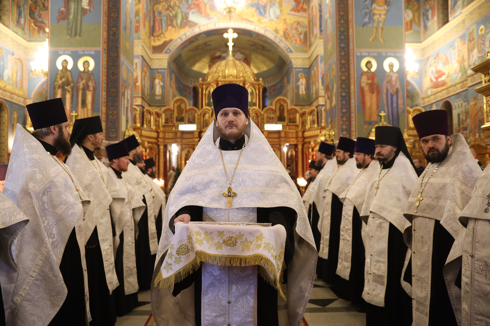 Его Высокопреосвященству сослужили: секретарь Ханты-Мансийской епархии игумен Антоний (Кирпичев), благочинный Ханты-Мансийского благочиния протоиерей Сергий Кравцов, ключарь Воскресенского кафедрального собора иерей Александр Петюр, клирики Филиппинско — Вьетнамской епархии иеромонах Иоанн (Гондаяо), духовенство Ханты-Мансийского благочиния. Диаконский чин возглавил диакон Даниил Матвеев.