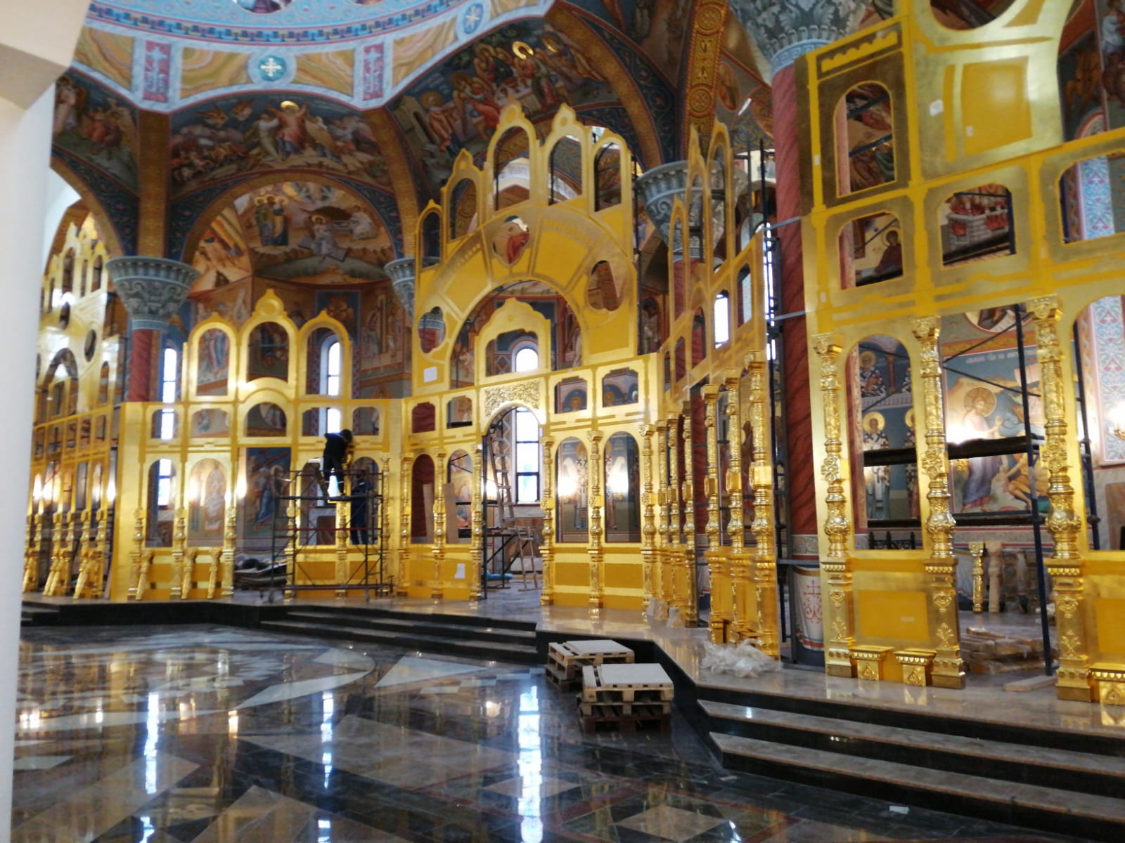 Заканчивается роспись алтарной части собора, идут подготовительные работы для установки центрального паникадила. Завершена укладка мозаичного пола, продолжается отделка внутренних помещений и парковки. Полным ходом идёт благоустройство примыкающей к зданию храма территории.