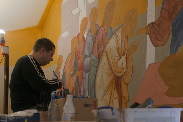 - Нас работает пока шесть человек. На алтарную часть и два придела вплоть до линии солеи у художников уйдёт около пяти месяцев, - добавил мастер.