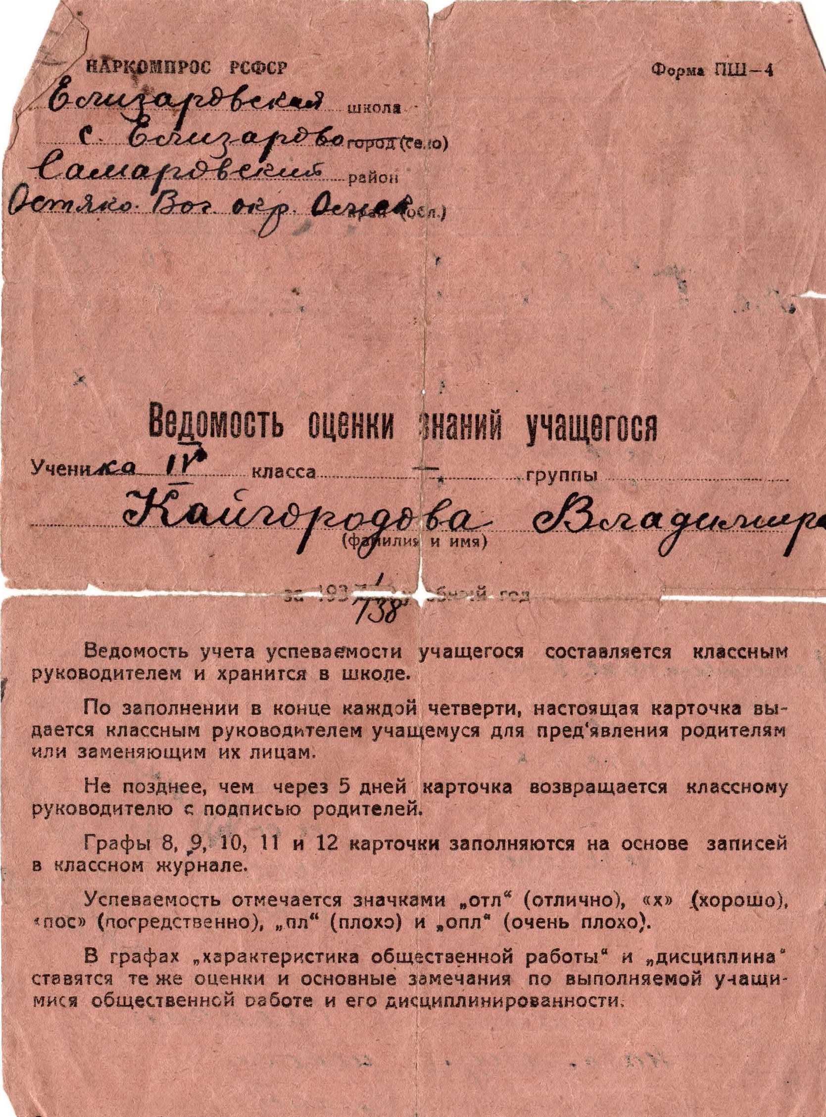 Ведомость ученика 4-го класса Елизаровской школы Володи Кайгородова