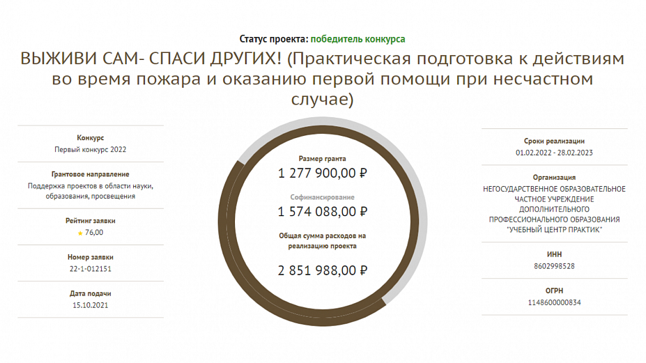 Негосударственное образовательное частное учреждение дополнительного профессионального образования «Учебный центр Практик» одержал победу в первом конкурсе 2022 года Фонда Президентских Грантов РФ по направлению в области науки, образования и просвещения. В этом году призовой фонд на развитие проекта «Выживи сам – спаси других!» составил 2 851 988,00 рублей.