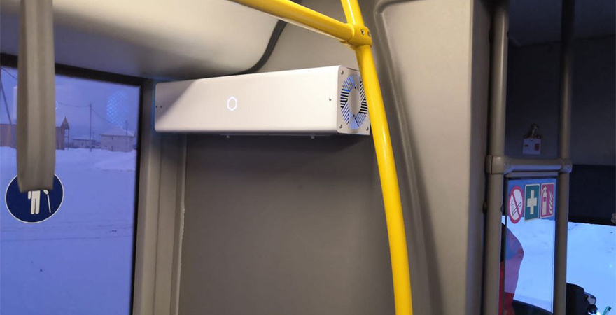 Похожими устройствами в окружном центре уже оснастили «умные» остановки. Устройство помогает в борьбе не только с COVID-19, но и с иными патогенами в воздухе салона автобуса.