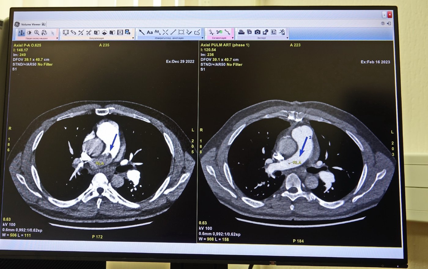 Одышка, слабость, сухой кашель — с такими симптомами в больницу поступил сургутянин 49 лет. Жалобы у мужчины усугубились после перенесенной коронавирусной инфекции и пневмонии в 2021 году. Симптомы постепенно нарастали. Диагностический поиск привел к разгадке. На компьютерной томографии врачи обнаружили массивный тромб, который занял почти все пространство правой легочной артерии, частично левой, и фактически изолировал часть легких от кровоснабжения.