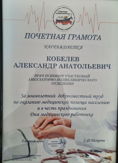 Сотруднику БУ «Советская психоневрологическая больница» врачу-психиатру А.А. Кобелеву вручена Почетная грамота от главного врача БУ «Советская психоневрологическая больница» С.Ф. Назаровой и Благодарственное письмо от Начальника Управления образования администрации Советского района Н.В. Черемных