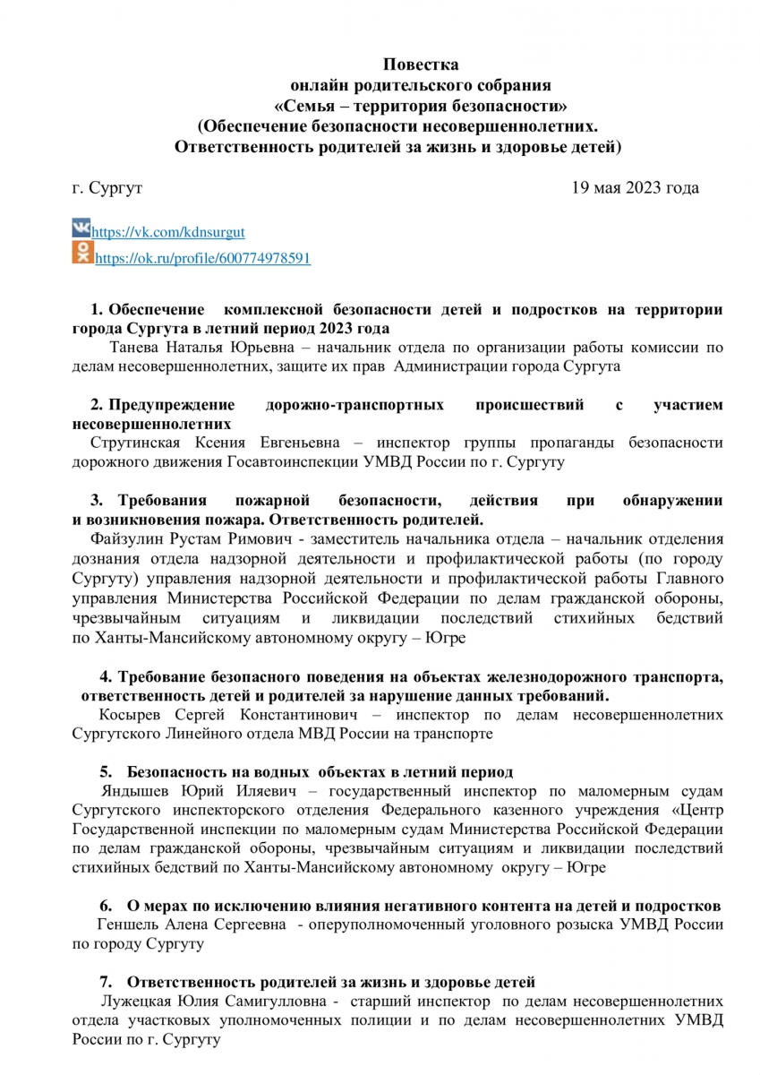 19 мая 2023 года в онлайн формате состоится общегородское родительское собрание «Семья – территория безопасности» по вопросам обеспечения безопасности несовершеннолетних, ответственности родителей за жизнь и здоровье детей в летний период 2023 года.