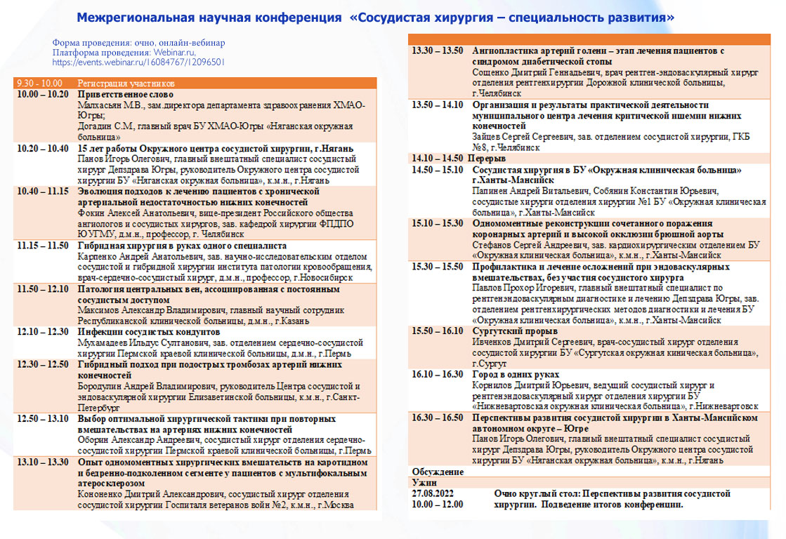 Научная часть конференции, будет посвящена теме развития сосудистой хирургии в целом, новым методам лечения и диагностики, а также операциям, проводимым на стыке специальностей. Участники конференции обсудят и перспективы развития сосудистой хирургии округа.
