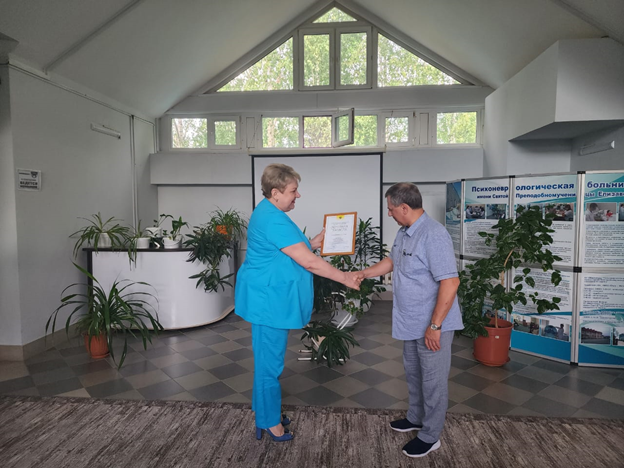 09 августа 2023 года в БУ ХМАО-Югры «Психоневрологическая больница имени Святой Преподобномученицы Елизаветы», главный врач Горбачева Ирина Владимировна торжественно вручила Почётную грамоту Министерства здравоохранения Российской Федерации заведующему общепсихиатрического отделения Дегтяреву Юрию Петровичу за многолетний добросовестный труд и профессиональное мастерство.